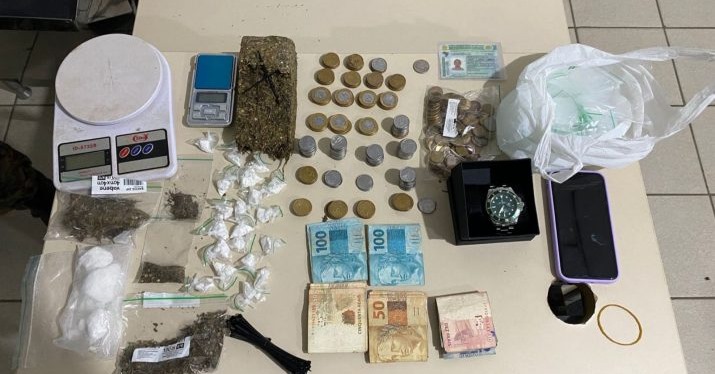 Um homem foi preso em flagrante com diversas porções de drogas no bairro Miro Cairo, nesta terça-feira (18). Os policiais ainda apreenderam R$ 4.106 reais em espécie com o suspeito.