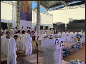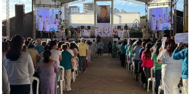 A comunidade católica de Vitória da Conquista se reuniu nesta sexta-feira (15) para celebrar a padroeira da cidade, Nossa Senhora das Vitórias. O evento, que marcou o encerramento do novenário, aconteceu no Parque de Exposições e atraiu grande participação dos fiéis.