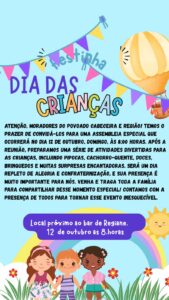No próximo domingo, 12 de outubro, os moradores do povoado Cabeceira e região têm um encontro marcado para celebrar o Dia das Crianças com muita alegria e diversão!